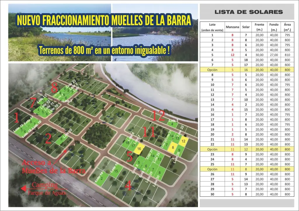 30 solares. Terrenos de 800 metros cuadrados en el fraccionamiento Muelle de la Barra junto al Arroyo Chuy y a 6 cuadras de la playa