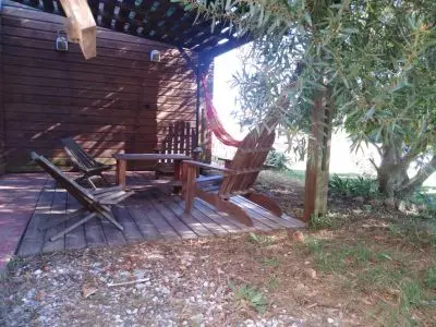 Coqueta cabaña , con terraza y vistas al mar en un entorno de pinos .En zona muy tranquila en playa...