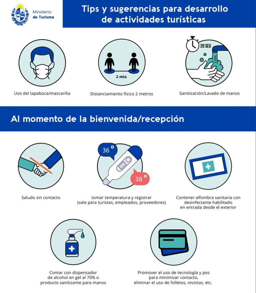 Al momento de la recepción de los turistas, piden que los saludos se den sin contacto, se tome la temperatura de quienes lleguen al lugar, y que en los lugares de acceso haya una alfombra sanitaria con desinfectante. Además, es indispensable contar con un dispensador de alcohol en gel al 70% o producto sanitizante.