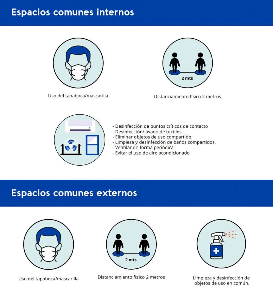 En espacios comunes internos, además del uso de tapaboca y el distanciamiento físico, piden la desinfección de puntos críticos de contacto, lavado de productos textiles, eliminar objetos de uso compartido, ventilación de forma periódica y evitar el uso de aire acondicionado.